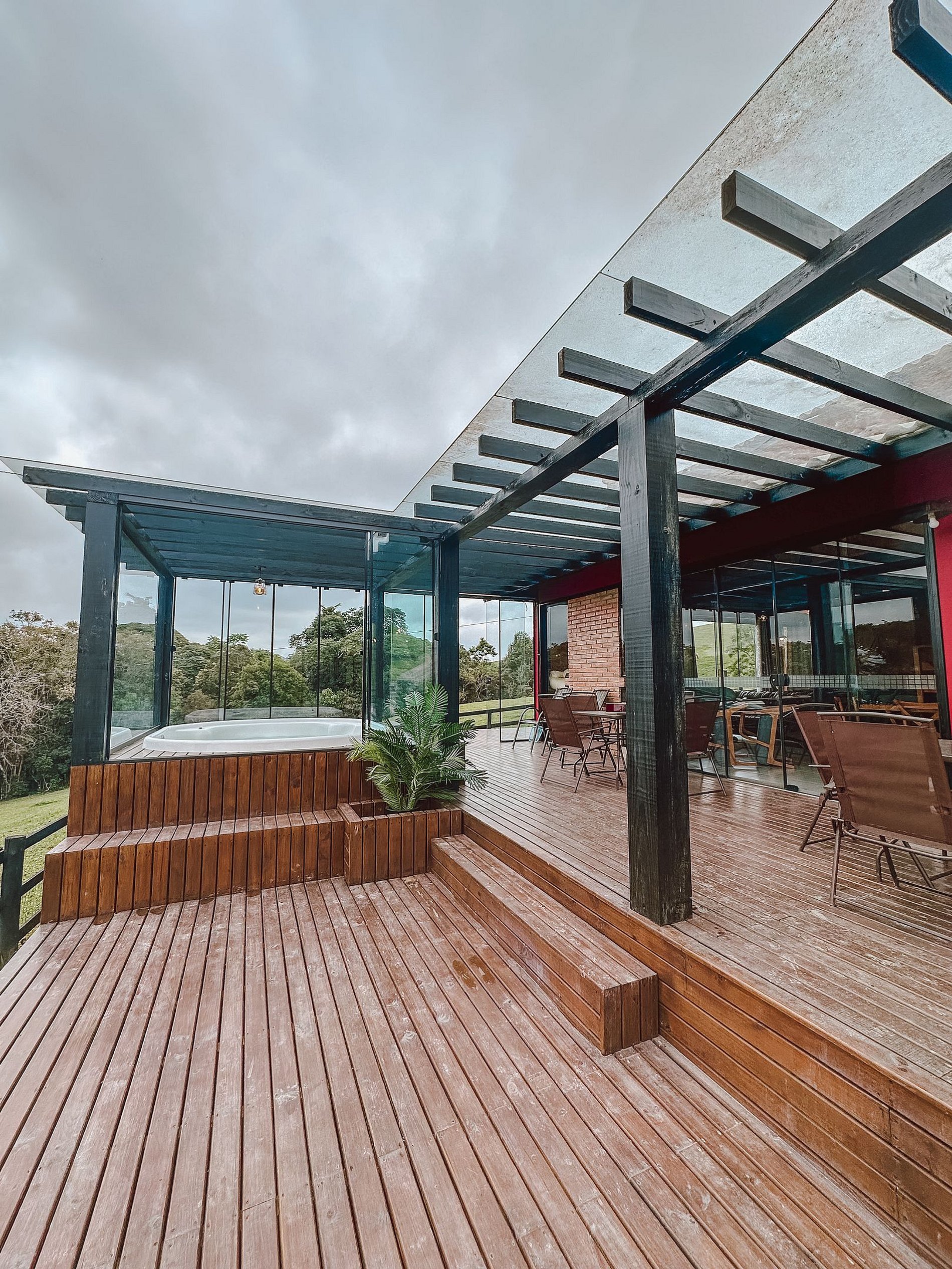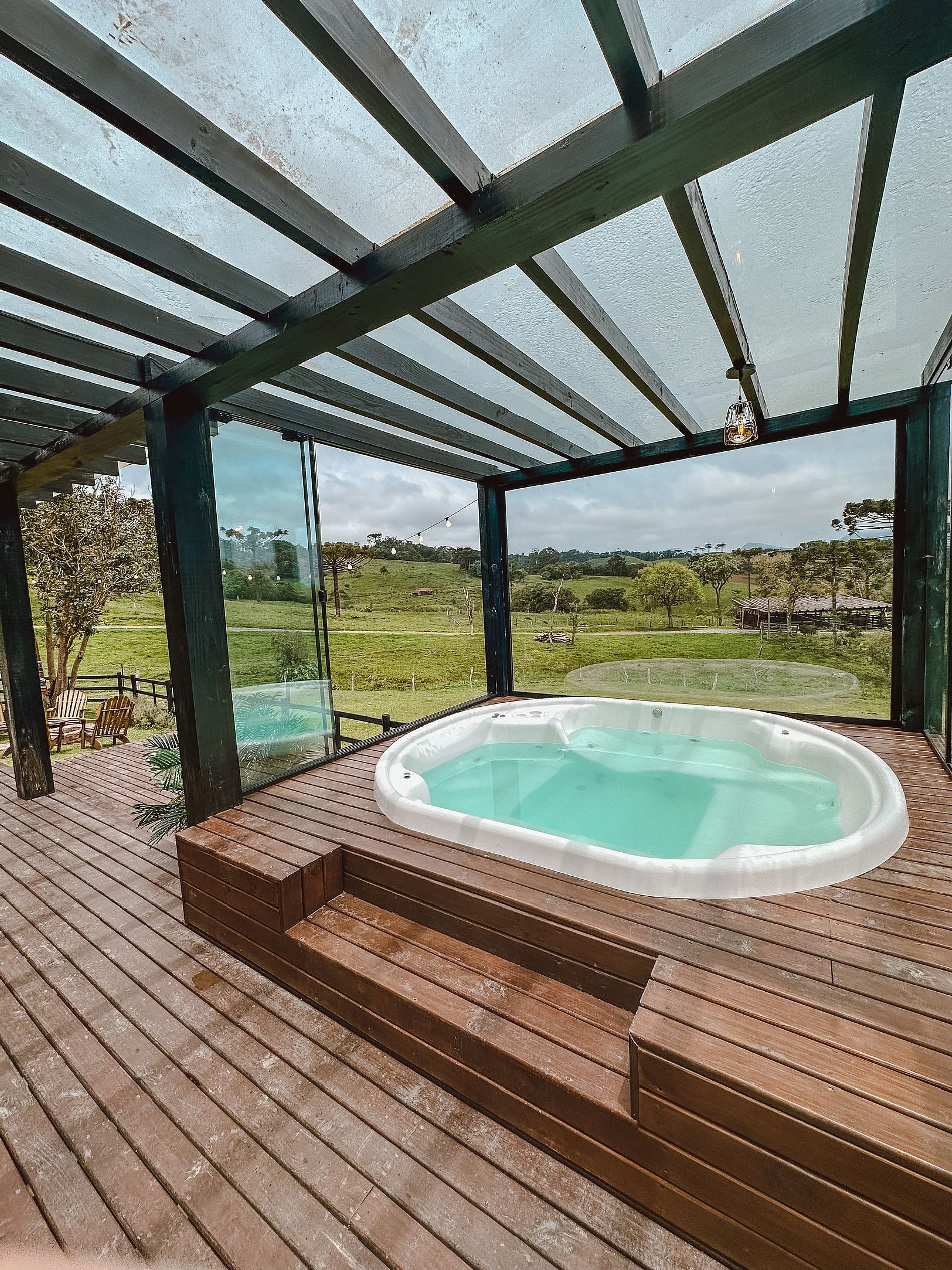 Área externa com Jacuzzi aquecida e coberta e fogo de chão.