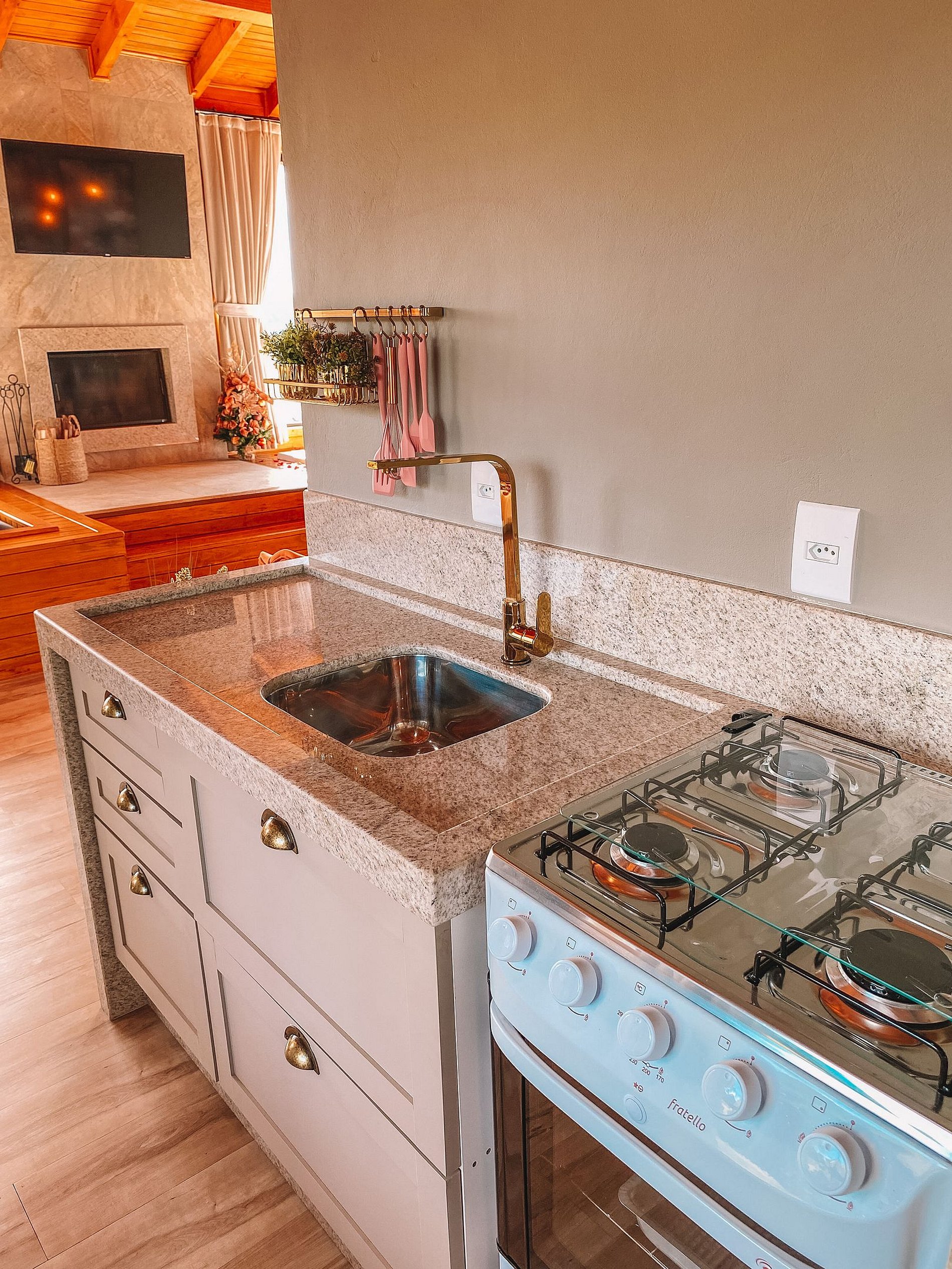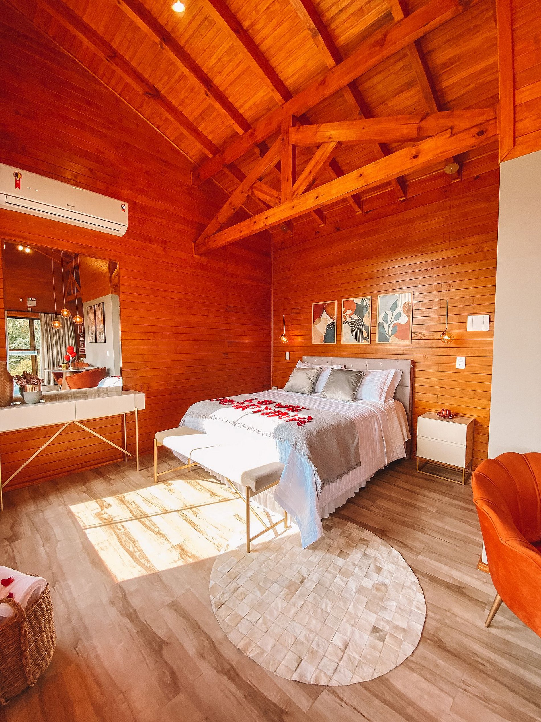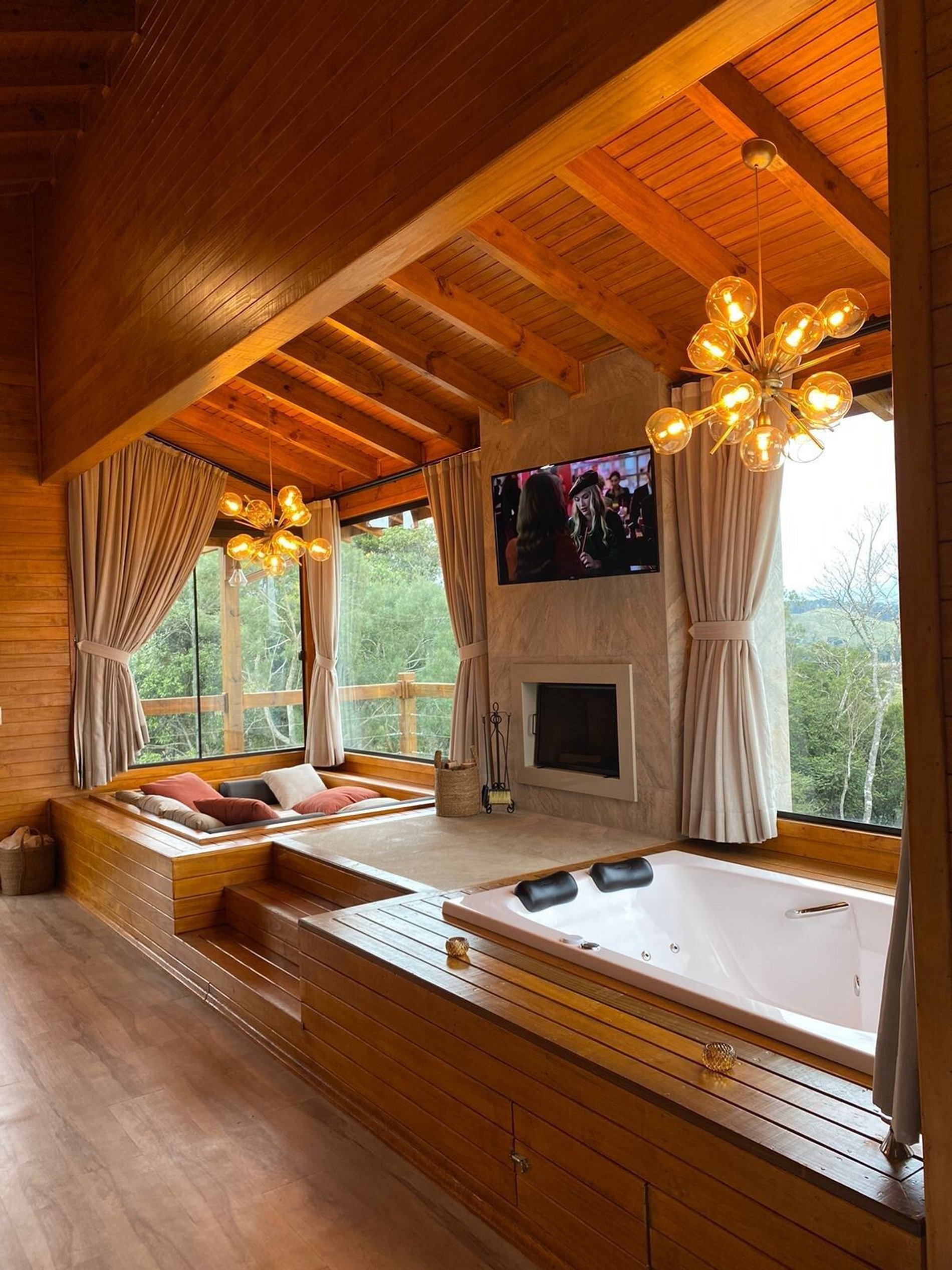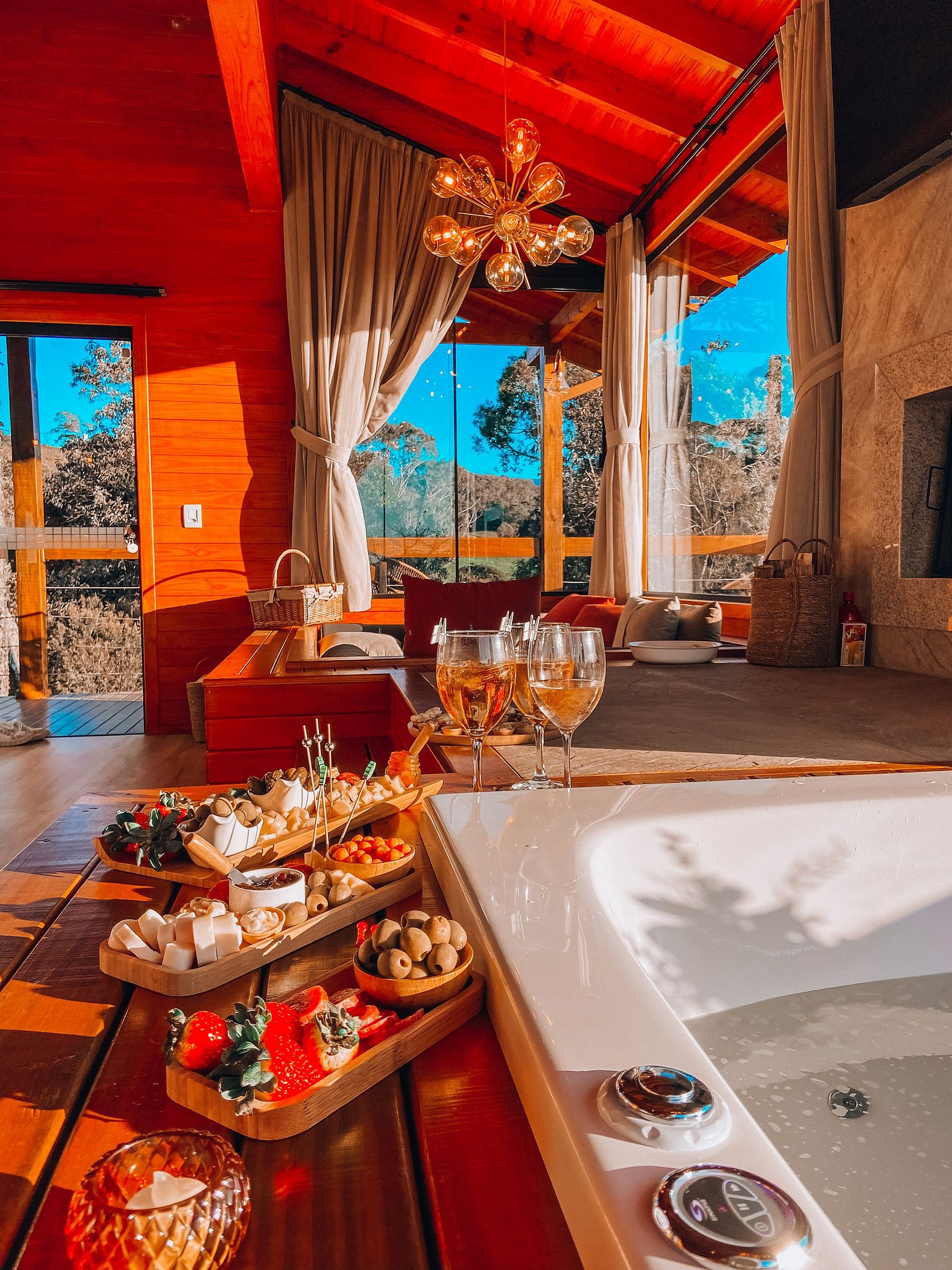 O Chalé possui banheira com hidromassagem, lareira, tv com Netflix e YouTube, Wi-Fi, ar condicionado, roupa de cama, banho, roupões, cozinha com fogão, microondas, forno elétrico, geladeira, churrasqueira elétrica, aparelho de fondue e demais utensílios.